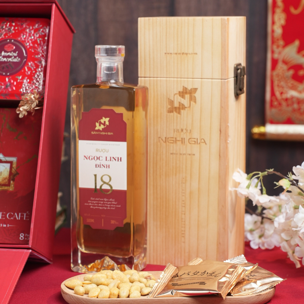 Điểm nhấn đầu tiên trong Set quà là Rượu Ngọc Linh Đỉnh 18 (500ml) – dòng rượu cao cấp được chưng cất từ gạo Japonica kết hợp men thuốc bắc và tinh chất Sâm Ngọc Linh quý. Hương vị êm mượt, hậu vị sâu, giúp bồi bổ sức khỏe. Trong văn hóa tặng quà, một chai rượu chất lượng Trong văn hóa tặng quà, một chai rượu chất lượng được xem là lời chúc cho may mắn, thịnh vượng, sức khỏe và sự gắn kết.